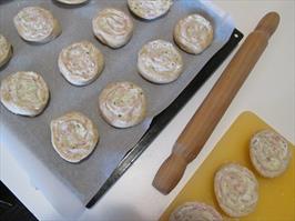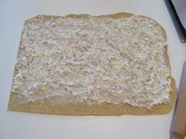 Mix the cream cheese, finely chopped leek, and ham, then spread the mixture over the dough.