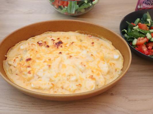 In a bowl, mix together the sour cream, sweet chili cream cheese, sweet chili sauce, and water.