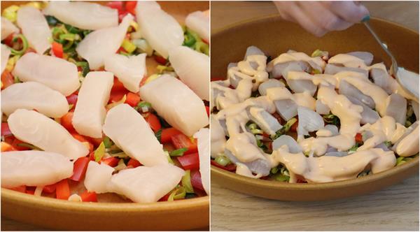 Spread the sautéed onion over the fish, seasoning with a little salt and pepper.