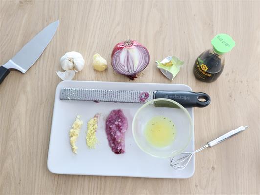 In a bowl, mix together the chicken broth, soy sauce, ginger, garlic, and red onion. Set the soy mixture aside.